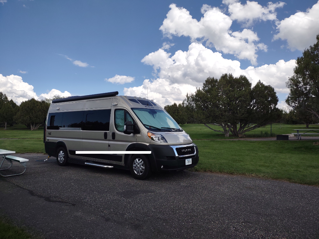 View of back of camper with reservoir in distance